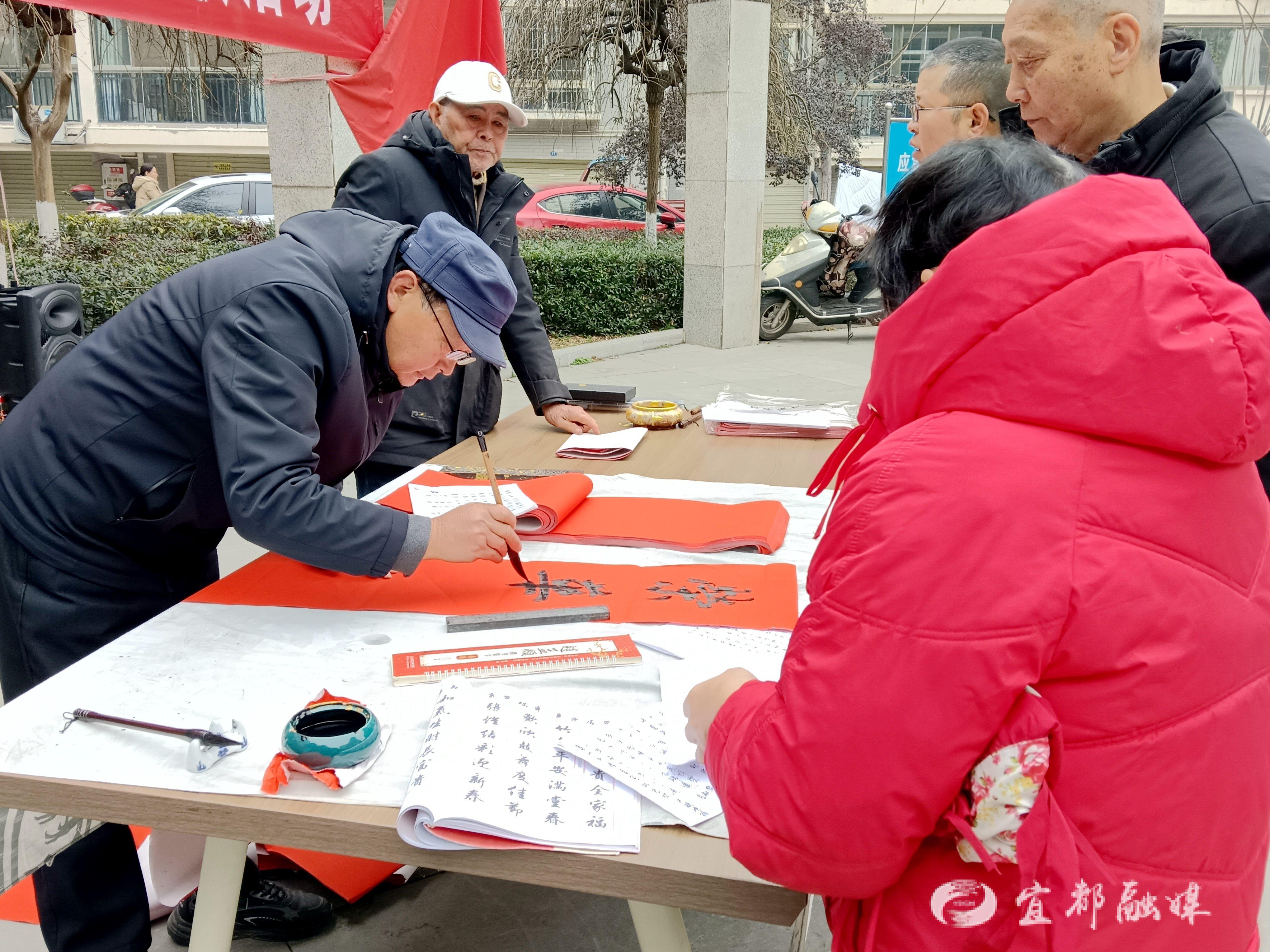最具年俗韵味的当数送春联区域,大红的春联纸整齐铺展,墨香袅袅沁人心脾。书法老师们凝神运笔、挥毫泼墨,笔锋流转间,一副副寓意吉祥、饱含祝福的春联跃然纸上,字迹或苍劲挺拔,或飘逸隽秀,尽显笔墨韵味。居民们驻足观赏、争相挑选,手捧红彤彤的春联,笑意写满脸庞,这份手写的年味,不仅承载着新春的美好期许,更让传统文化在指尖流转、在社区扎根。