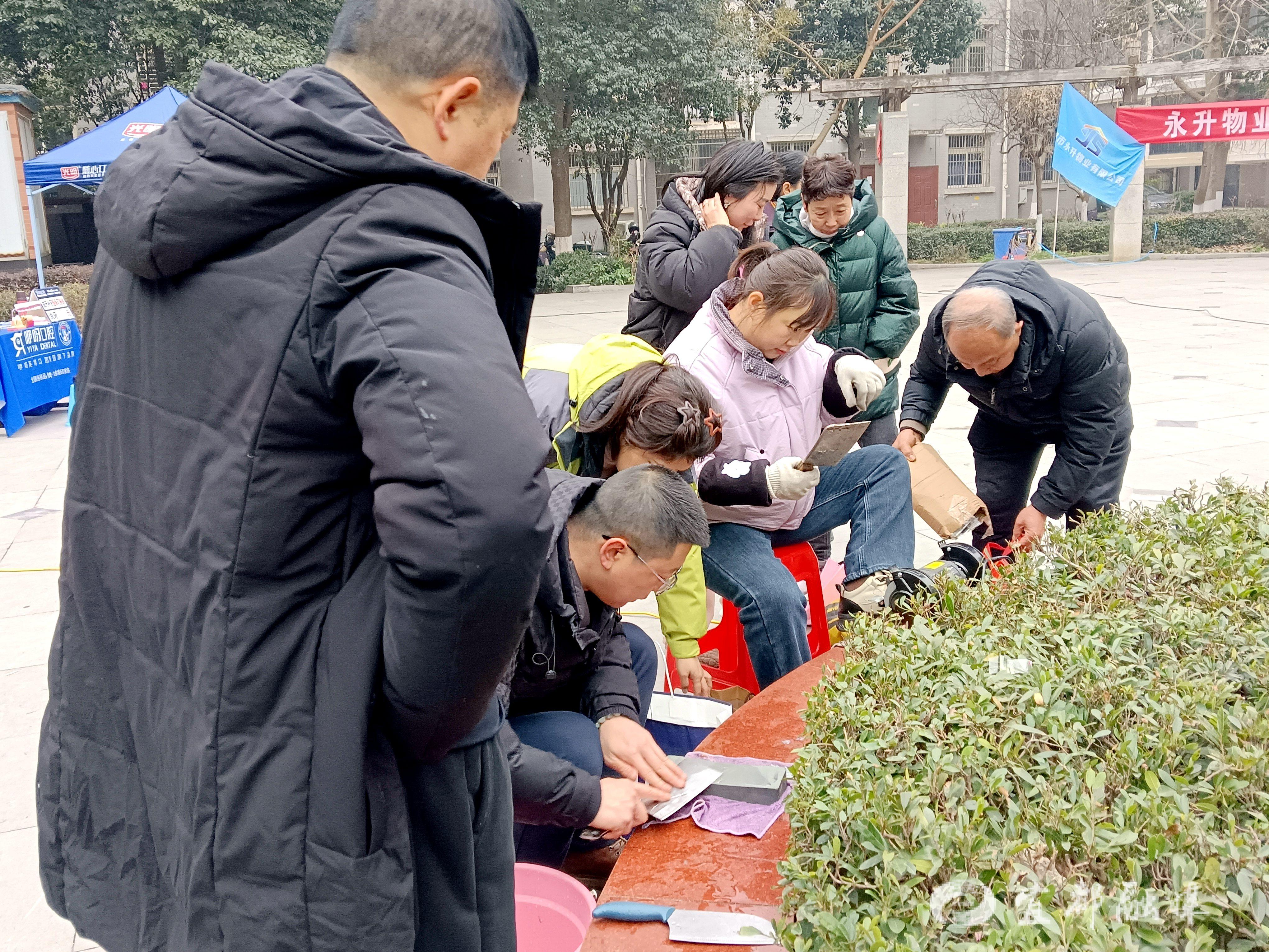 活动现场人气满满,各个服务点位前都排起了长队。磨刀区里,师傅们手法娴熟,伴着“嚯嚯”的磨刀声,原本钝涩的菜刀、剪刀被打磨得锃亮锋利。居民们接过磨好的刀具,脸上露出满意的笑容,纷纷为师傅的好手艺点赞。