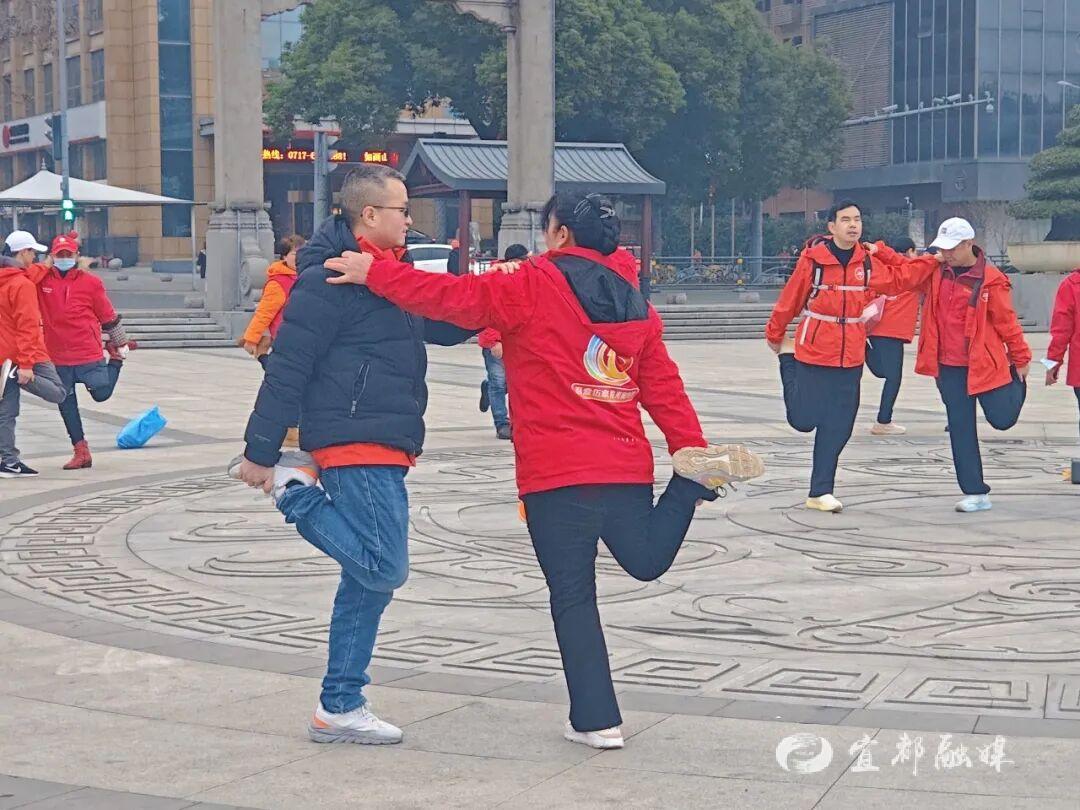 每个周六的早上,赵荣成拿着盲杖从家里出发,步行约500米,来到十一中公交站,搭乘2路公交,经过12站后,她在市政府站下车。志愿者已经在公交站等候,领着赵荣成穿过马路,到达滨江公园双亭广场。这里有一群伙伴,正等着和她一起跑步。