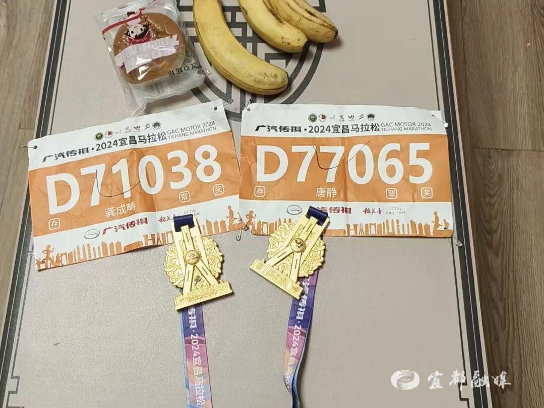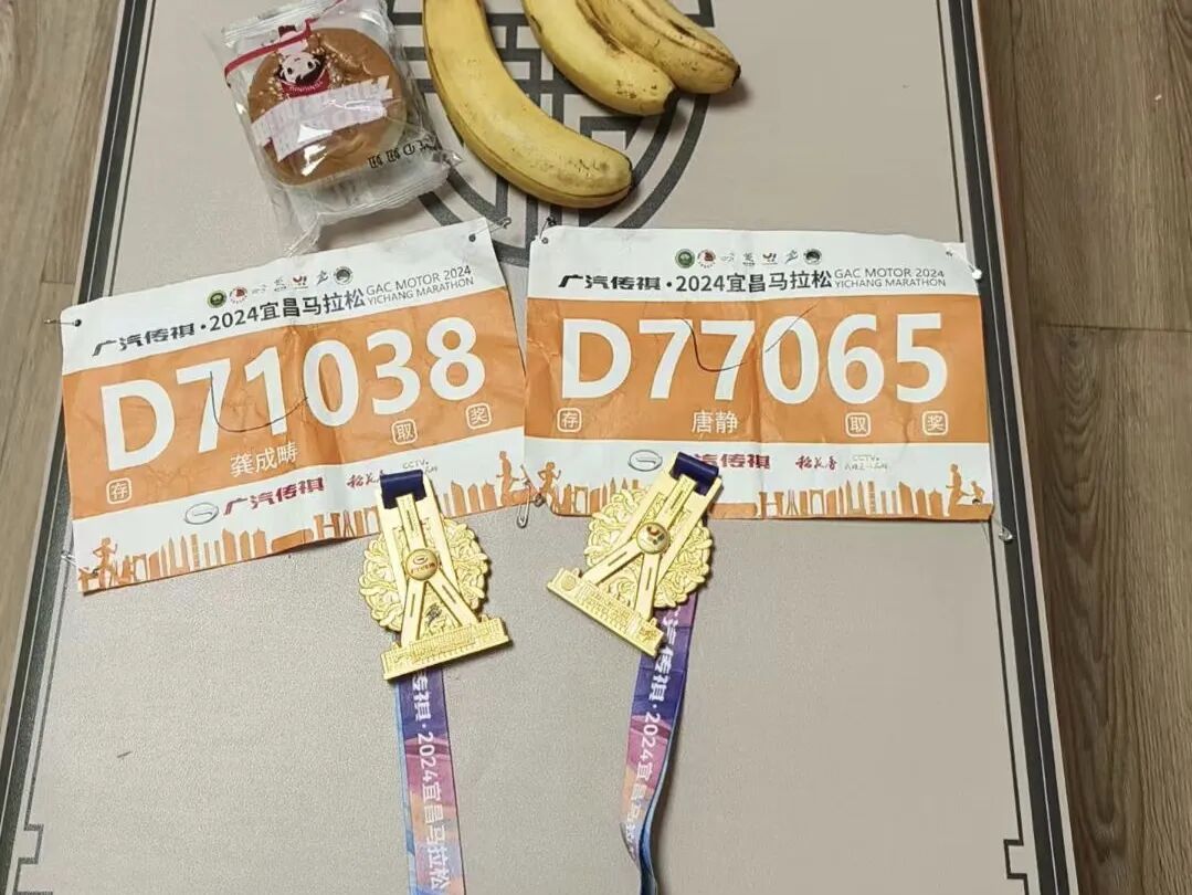 ▲唐静和龚成畴参加马拉松时的号码布和完赛奖牌