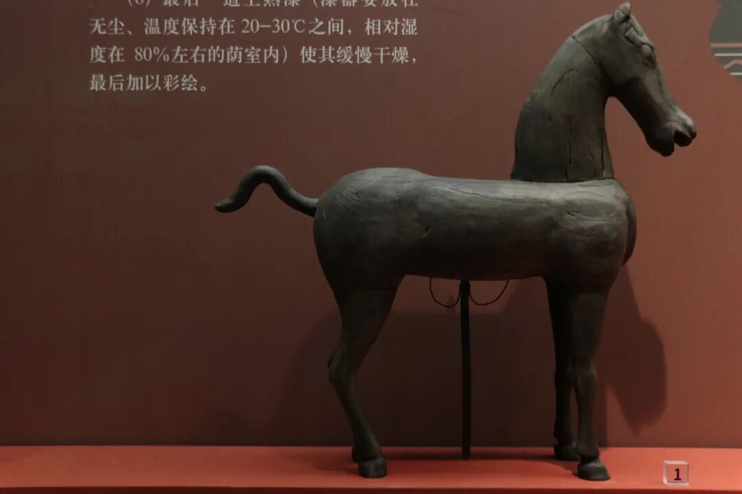 “器物无声,观其有魂”。在宜昌博物馆“千载峡州”展厅,一件出土于宜都的黑色漆木马,半人高,静立于暖红展板前。刀凿之痕仍清晰可辨,身形圆润,马尾垂顺,腿部肌肉紧致,隐蓄力量。