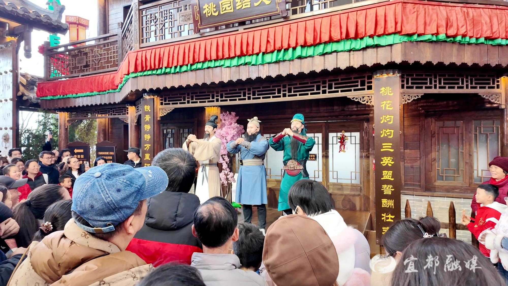 早上的第二场演出是《桃园结义》,在市井街绣楼前,满怀壮志的刘备与关羽、张飞结成拜把兄弟,共同实现自己人生的美好理想。崔建国化身关羽,与观众零距离互动。