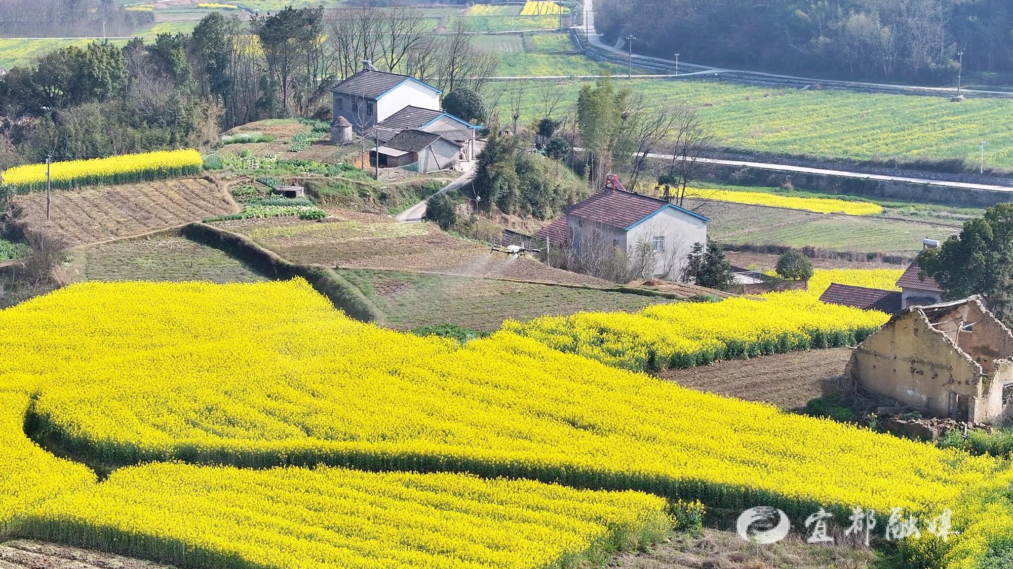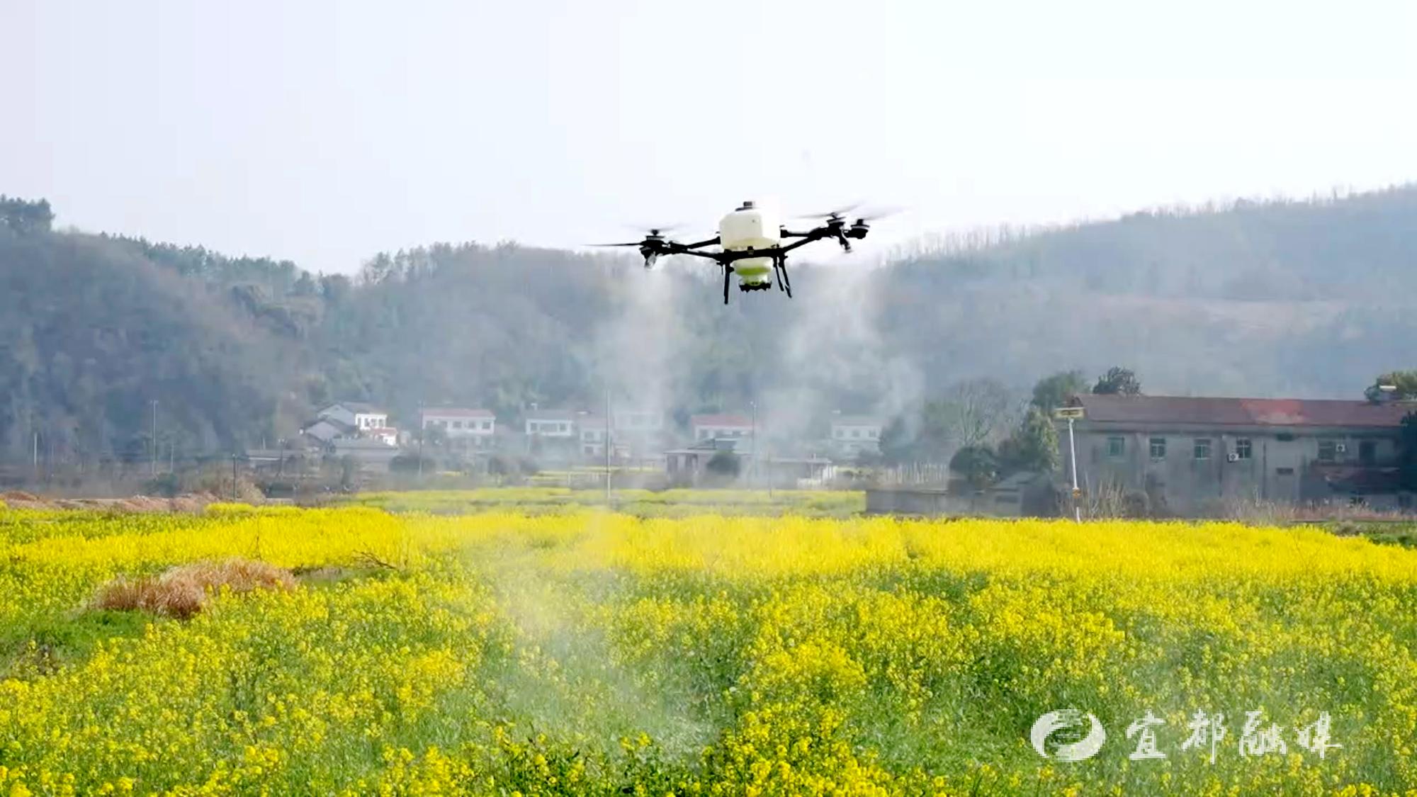 宜都市松木坪丰裕粮油飞防服务队负责人李华东介绍:“我们本次油菜‘一促四防’采用的是最先进的大疆T100S无人机,它的承重量在60公斤以上,大概能够飞30-40亩,五千亩的面积大概在4天能够全部完成,项目区以内涵盖有农户的部分田块。”