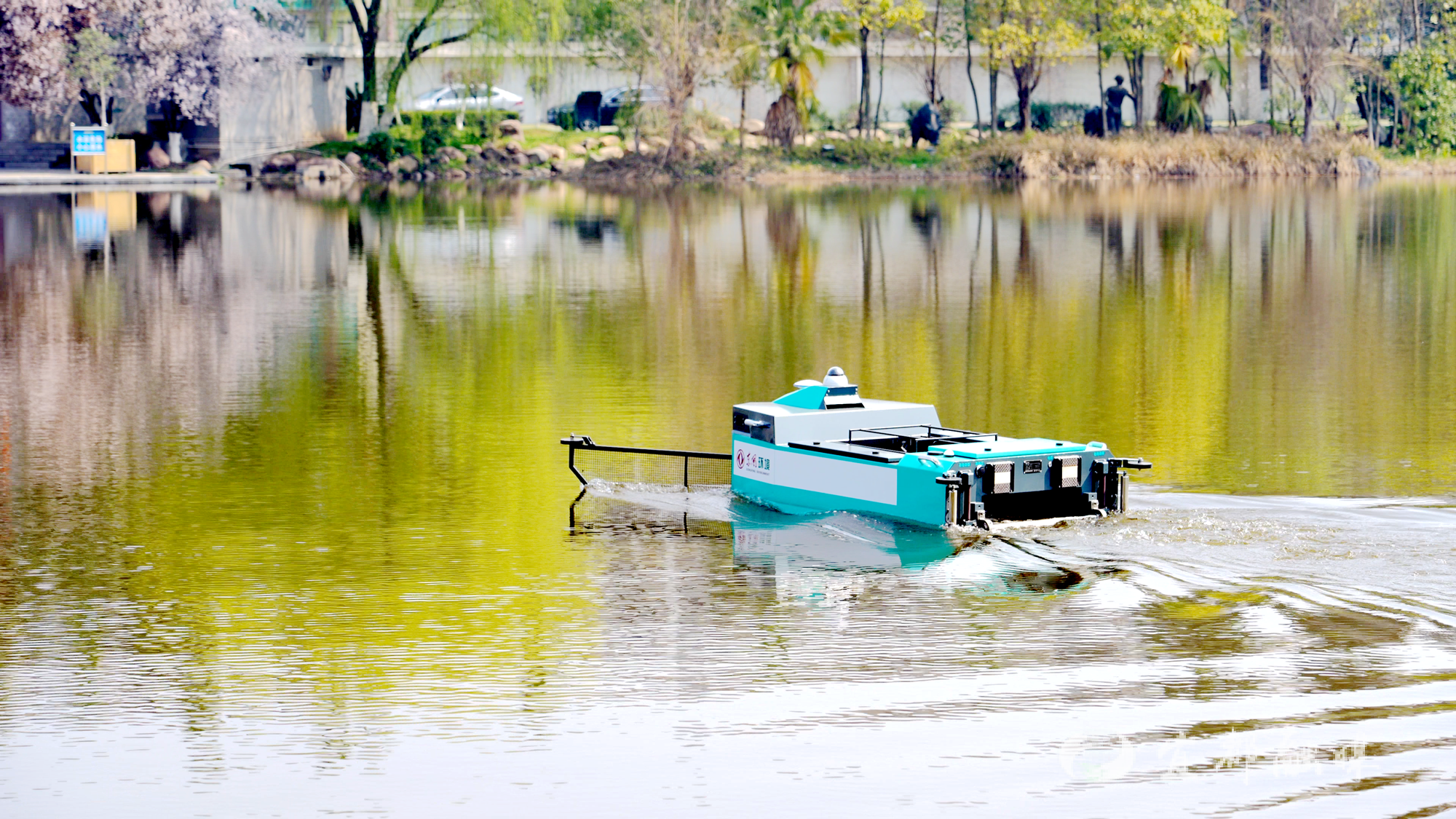 除了陆地“双雄”,湖心公园的水面上也有了新变化。蓝绿相间的Smurf无人船正来回穿梭,所到之处,水面上的漂浮物和落叶被精准打捞。