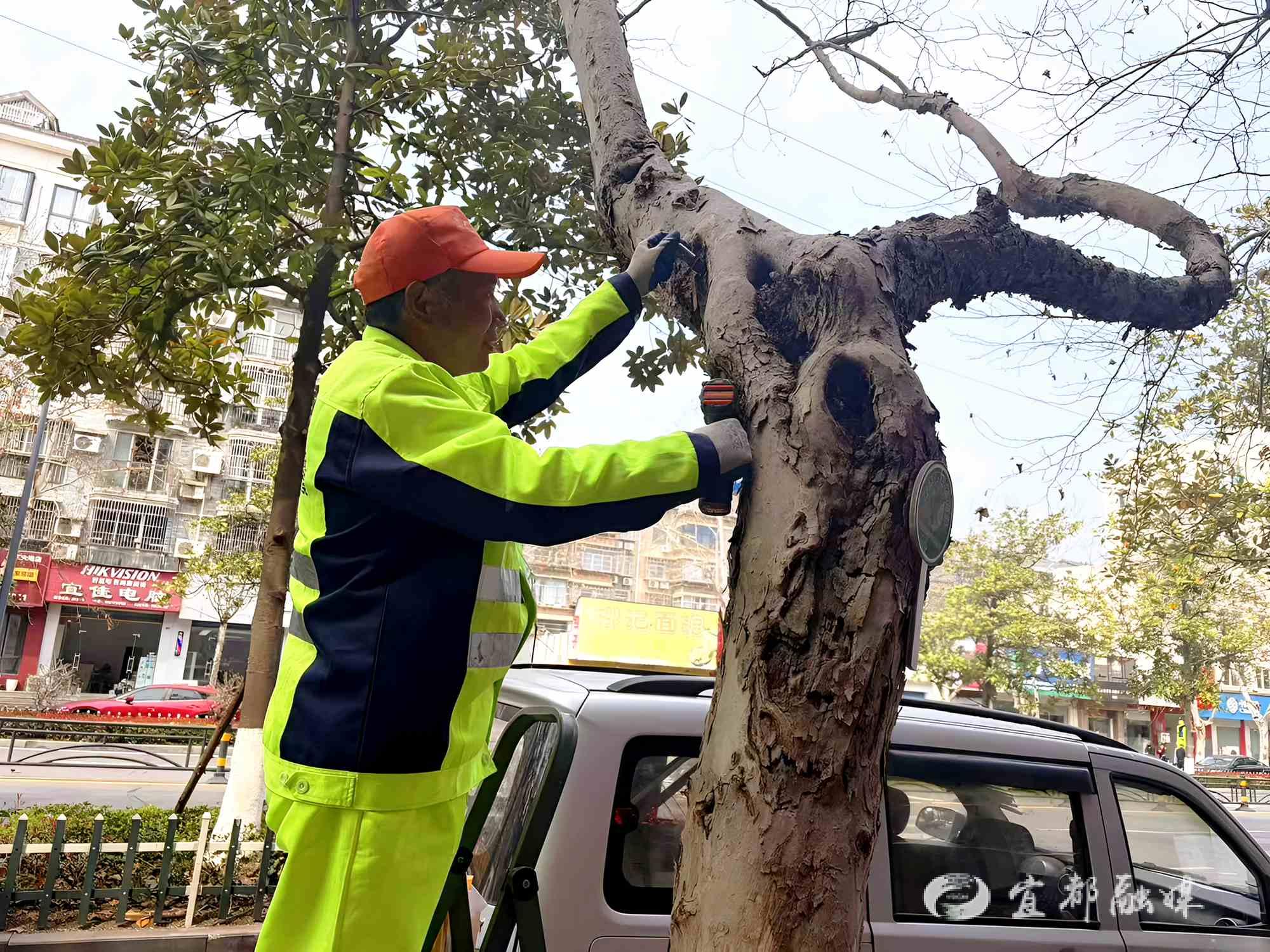 创新试点,树种改良实现长效治絮。为从根本上解决法桐飞絮困扰,实现长效治理,宜都市市政园林服务中心创新思路,在东门路开展法桐树种改良试点工程。前期,工作人员已完成该路段52株法桐的重度修剪,精准修剪冗余枝条、梳理树形,为后续高位嫁接工作筑牢基础。目前,园林工人正借助高空作业设备,有序开展高位嫁接作业,通过更换优良无絮法桐品种,彻底破解飞絮难题。此次试点工作将为全市法桐飞絮治理探索可复制、可推广的宝贵经验,助力城市绿化品质持续升级。