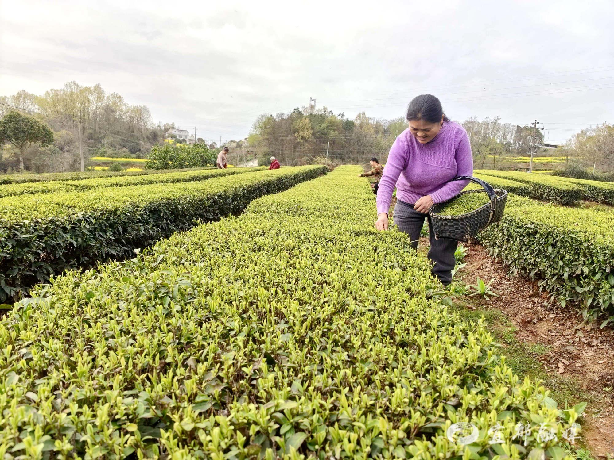宜都融媒讯(通讯员余倩)3月18日,连日阴雨天气迎来放晴,五眼泉镇龙口子村茶园正式开启2026年春茶采摘开园季。村民们抢抓晴好天气,抢采明前优质茶青,以辛勤劳作奏响春日增收序曲。