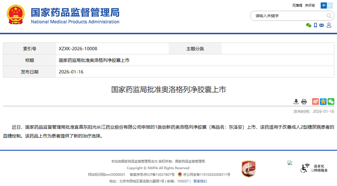 宜都融媒讯(记者 朱敏)记者近日从宜昌东阳光长江药业股份有限公司获悉,该公司自主研发的1类创新药奥洛格列净胶囊已获得国家药品监督管理局批准上市。