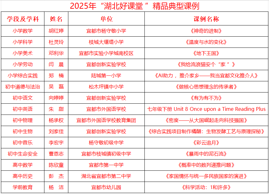 宜都融媒讯(通讯员 邹静)近日,2025年“湖北好课堂”展示活动遴选结果正式公布,宜昌市141节优秀课例获评省级精品典型课例。其中,宜都市15节课例成功上榜,4节课例亮相省级现场展示,获奖数量位居宜昌各县市区前列。