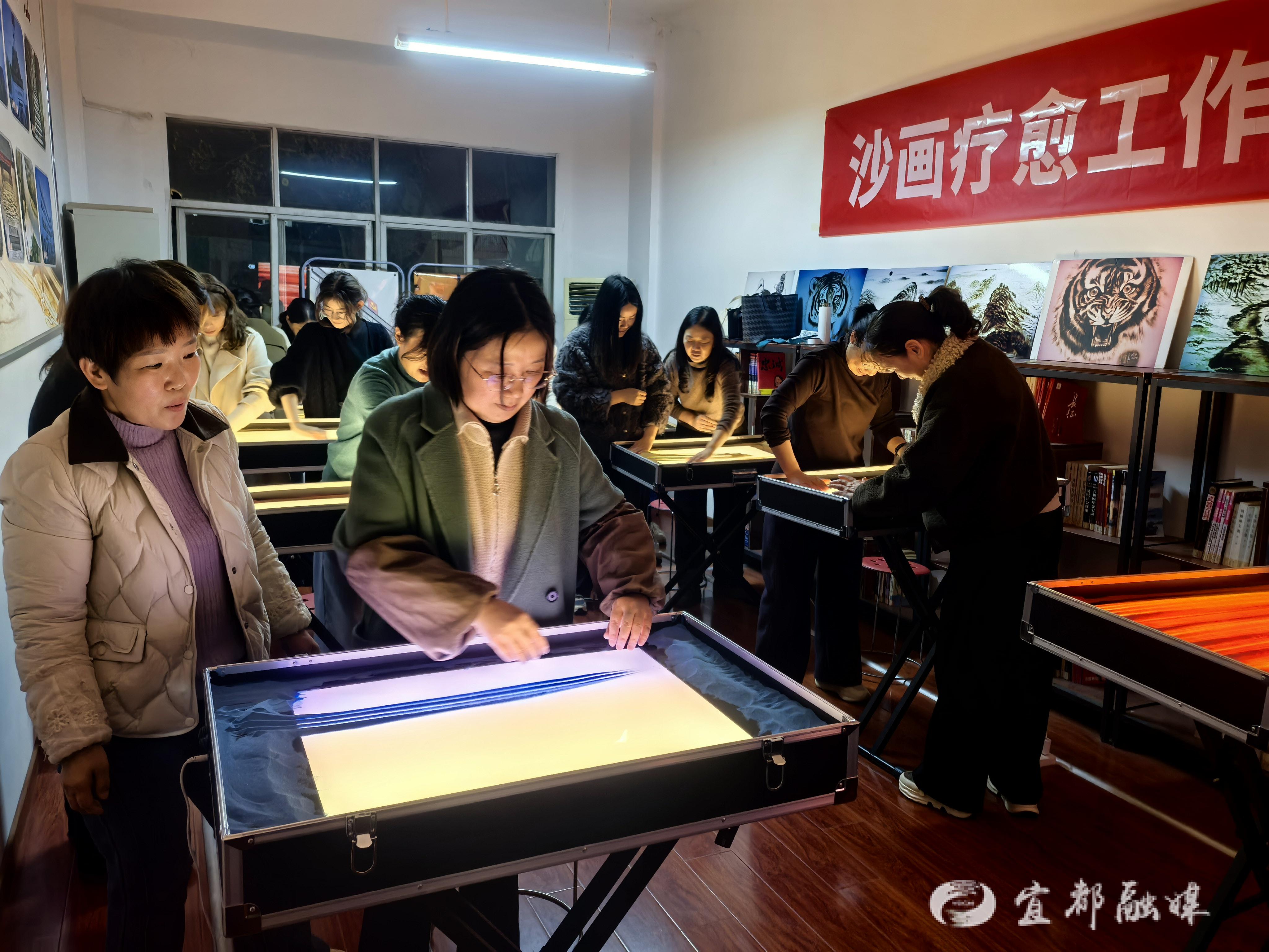 沙画课堂上,职工们以沙为墨、以台为纸,在光影流转间体验指尖生花的艺术魅力。课程注重手眼协调与创造力培养,让参与者在细沙流动中获得情绪释放与心灵疗愈。