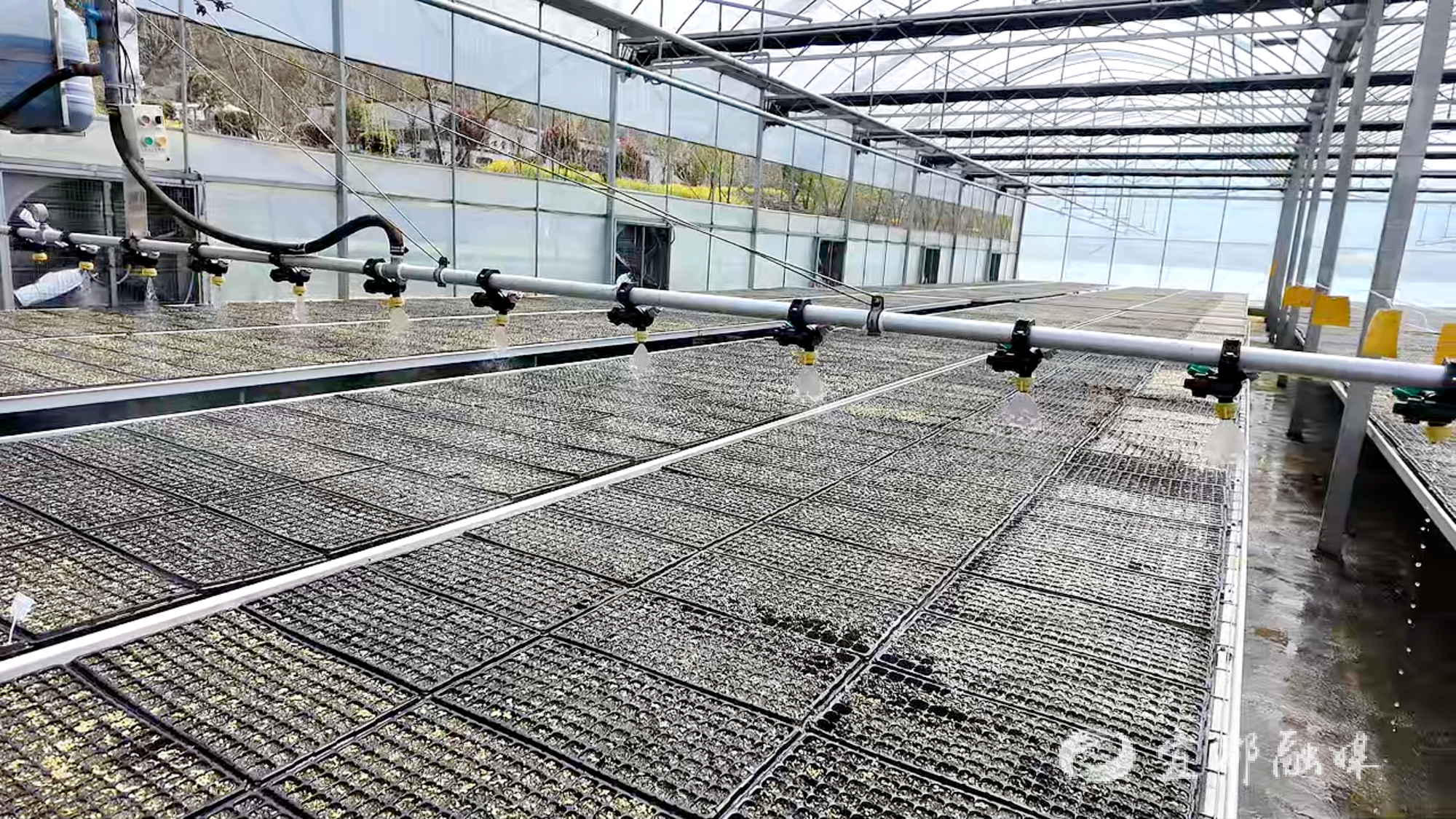 走进宜昌艺阳种苗科技有限公司的智慧连栋大棚,一排排育苗盘整齐排布,绿意盎然。智能喷灌系统均匀洒水,花卉苗、蔬菜苗长势喜人。