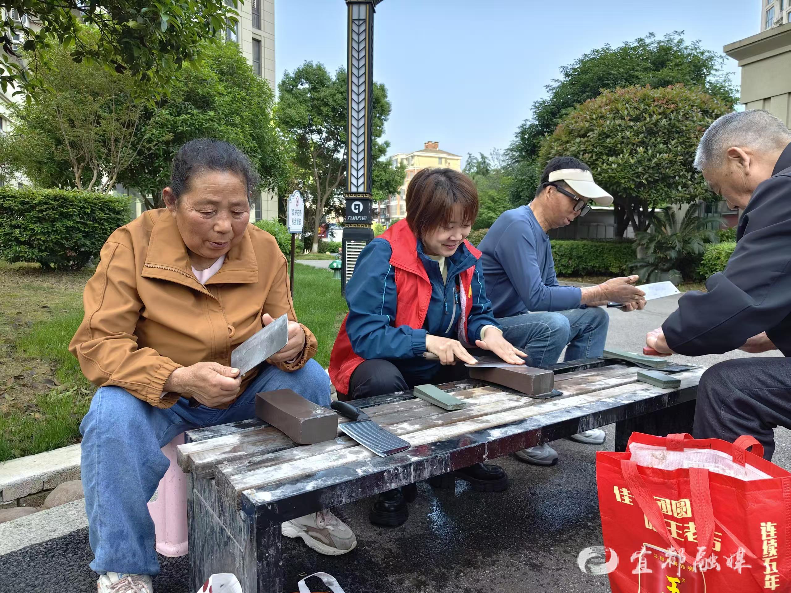 活动现场,志愿者们协助物业工作人员搭建摊位、维持秩序、引导老人儿童参与,成为连接邻里与物业的“红色纽带”,赢得了居民的纷纷点赞。活动现场设置了多项免费便民服务——打磨刀具、清洗地垫与眼镜,还提供血压测量等健康服务。这些服务看似微小,却精准对接了居民的日常需求,让业主感受到“家门口的便利”,真正实现“服务送到心坎上”。