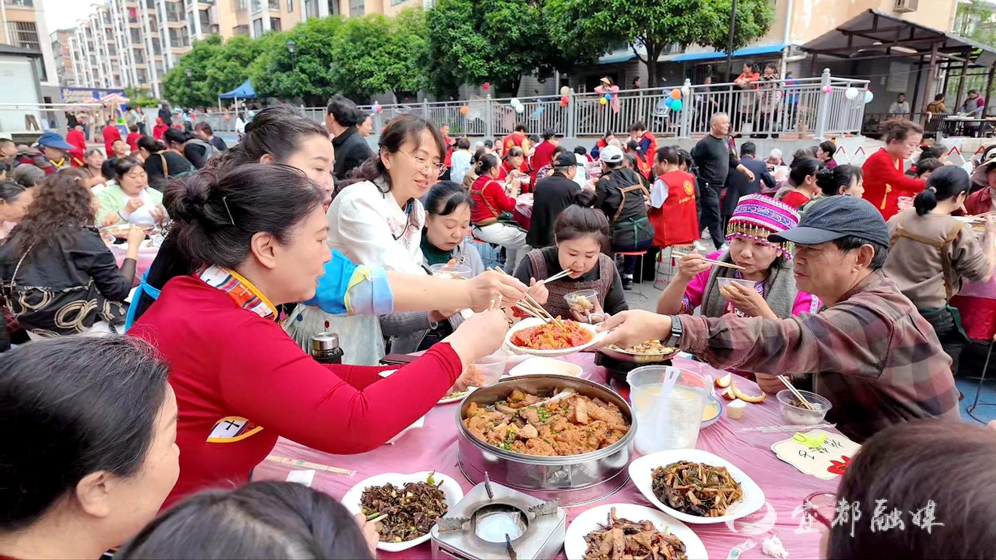 锦江社区居民高兰开心地说:“第八次参加这个活动了,感觉好温馨。百家宴好吃得很,有(抬)格子、好多的火锅,一会还上台去表演。我们社区居民自发地组织了节目《爱我中华》,体现各民族的大团结。”