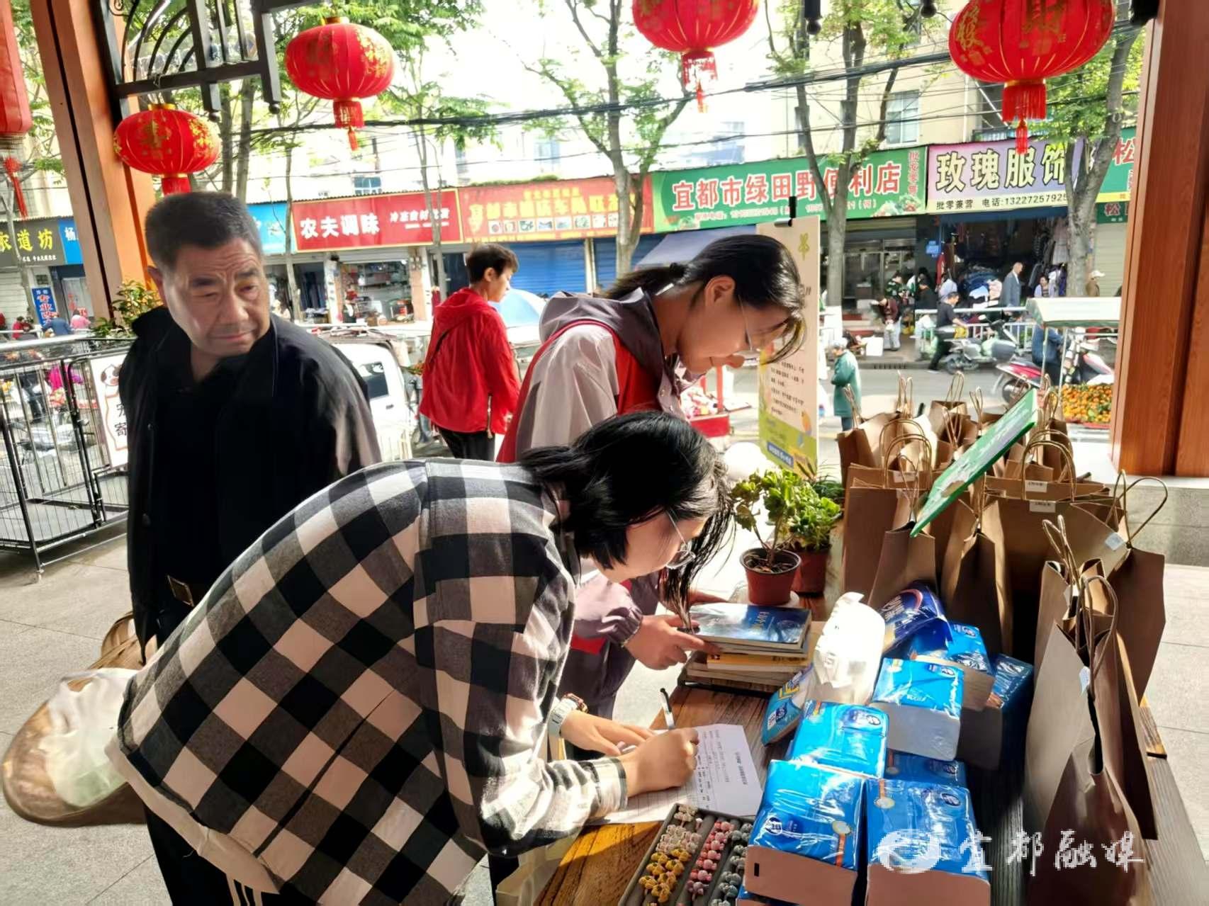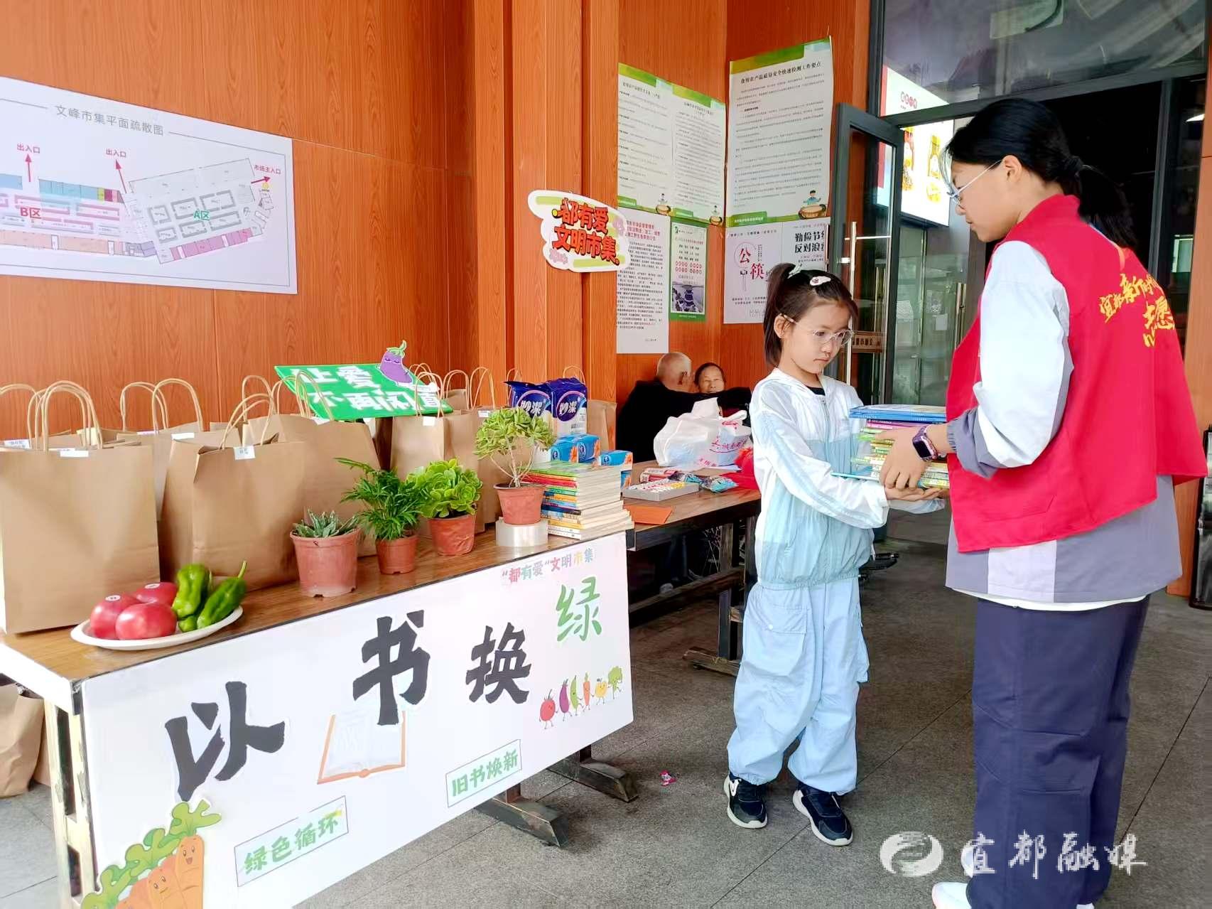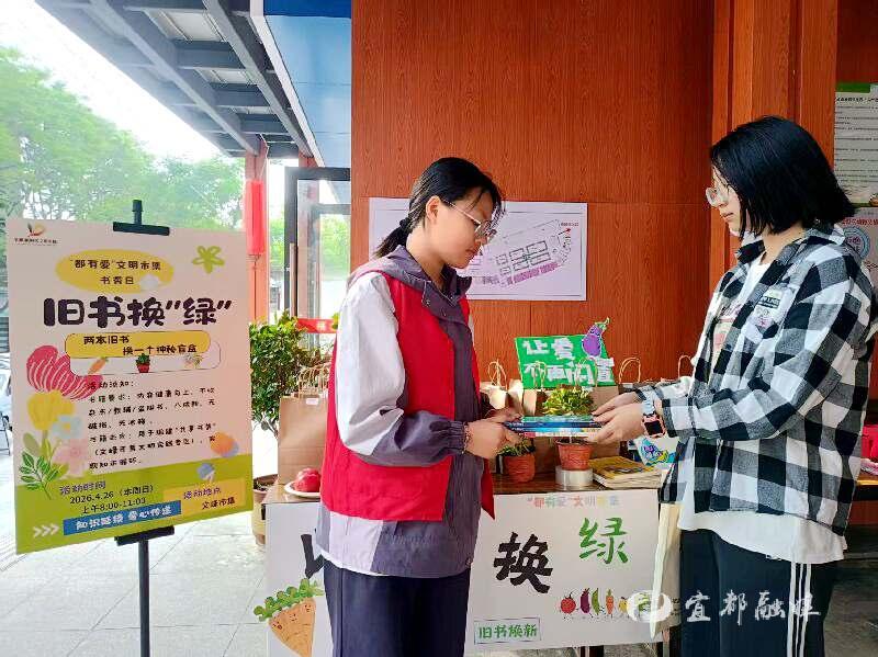 宜都融媒讯(通讯员 刘晓玲)4月26日上午,文峰市集书香萦绕、绿意盎然。依托全民阅读周契机,在市文明实践活动指导中心指导下,陆城街道胜利社区联合馨园社会服务中心,组织开展“都有爱”文明市集·书香日系列活动之“以书换‘绿’”主题活动,将书香文化巧妙融入市井烟火,以特色市集为载体丰富全民阅读形式,吸引众多市民与志愿者踊跃参与,让闲置书籍焕发新生,让绿色理念浸润人心。